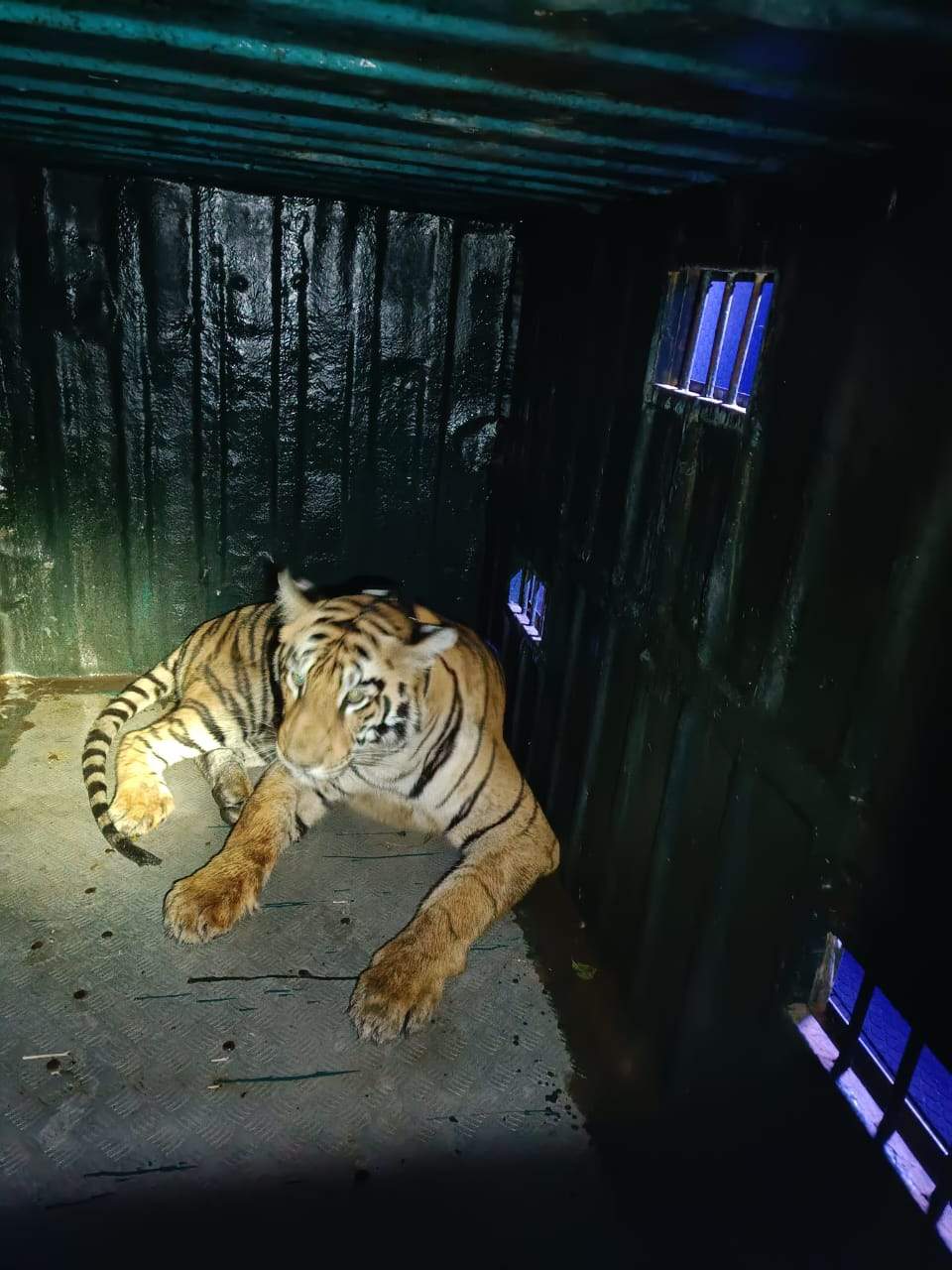 To aid future monitoring and ensure successful adaptation, she has been fitted with a VHF/GPS radio collar. The animal is being transported in a specially designed custom tiger transit crate to ensure safe movement.